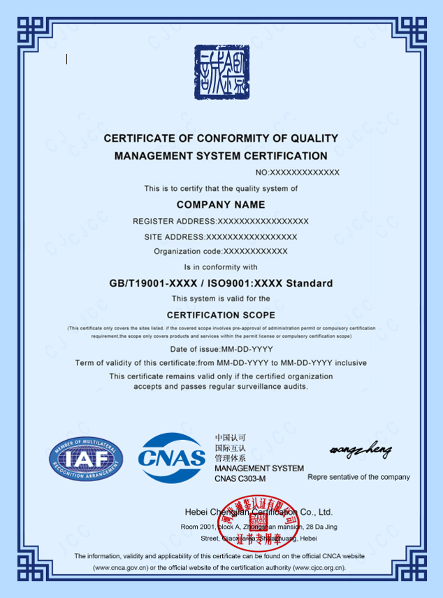 河北誠鑒認證有限公司(簡稱誠鑒認證/CJCC),創立于二零一七年,經國家認證認可監督管理委員會(CNAS)批準(批準號CNCA-R-2018-412),中國合格評定國家認可委員會(CNAS)認可(注冊號:CNAS C303-M)),是從事質量管理體系、環境管理體系、職業健康安全管理體系認證,具有獨立法人資格的第三方認證機構。